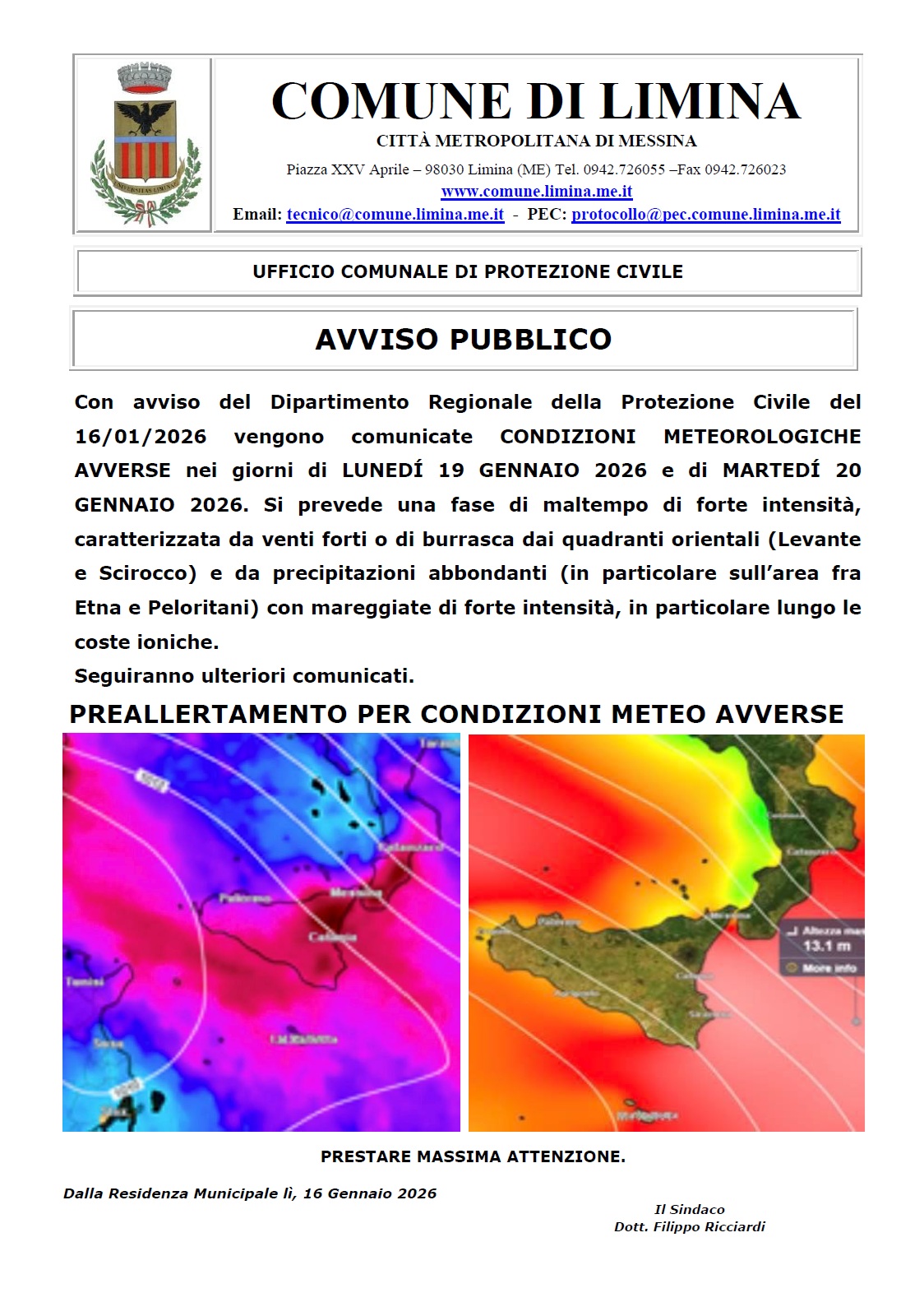 con avviso del dipartimento regionale della protezione civile del 16/01/2026 vengono comunicate condizioni meteorologiche avverse nei giorni di lunedi 19 gennaio 2026 e di martedi 20 gennaio 2026. si prevede una fase di maltempo di forte intensita' ,caratterizzata da venti forti o di burrasca dai quadranti orientali ( levante e scirocco ) e da precipitazioni abbondanti (in particolare sull' area fra etna e peloritani )con mareggiate di forte intensita' in particolare lungo le coste ioniche .seguiranno ulteriori.preallertamento per condizioni meteo avverse